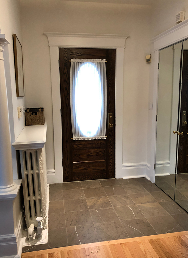 | BRIEF | Main floor revitalization including complete vestibule renovation (new slate floor, new double mirrored doors on closet, refinished front door with new sheer curtain and brass hardware, new radiator cover, and new pot lights). |